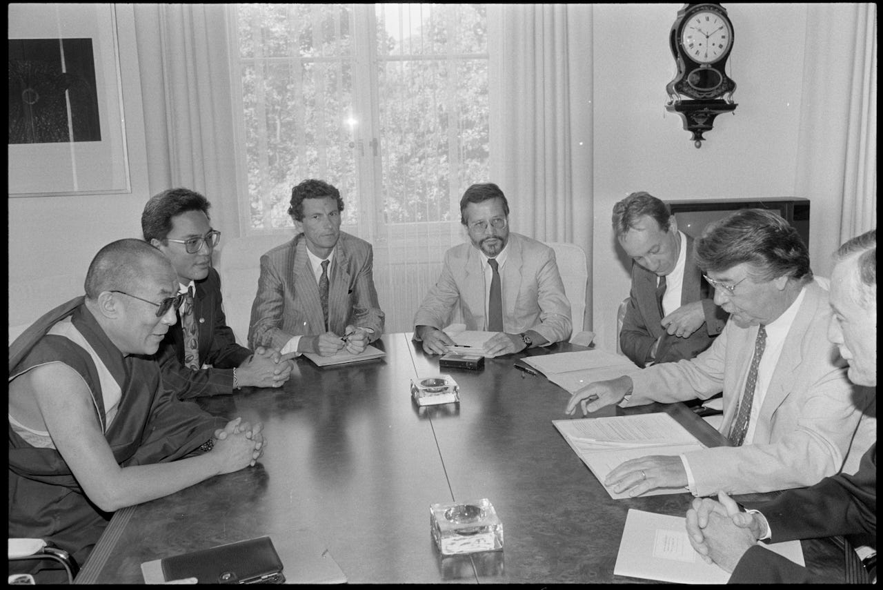 Incontro del Dalai Lama con il consigliere federale René Felber nel Palazzo federale di Berna, il 19 agosto 1991. Da l. a destra: Dalai Lama, Kelsang Gyaltsen (Tibet Bureau), Jean-Daniel Vigny, Marco Cameroni, Georges Martin, René Felber e Pierre-Yves Simonin. Fonte immagine: Schweizerisches Nationalmuseum LM-179466.6